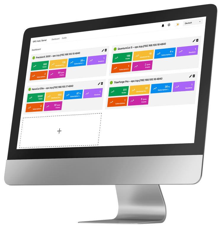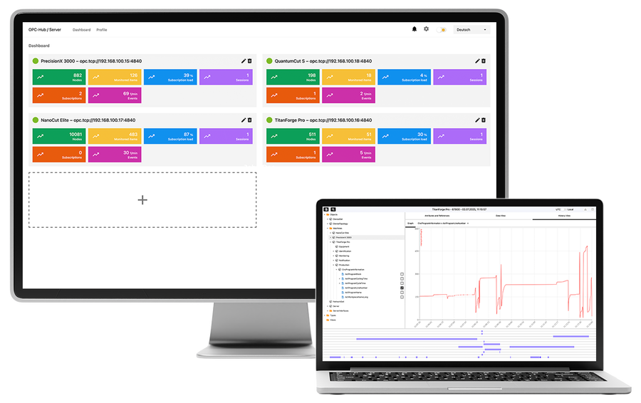 So lassen sich bestehende Dashboards und Anwendungen, die intern OPC-UA-Clients nutzen, ohne Anpassungen weiterverwenden, inklusive Zugriff auf Live-Daten und historische Werte. Der Hub unterstützt die neuesten OPC-UA- und umati-Standards und sorgt für maximale Kompatibilität.